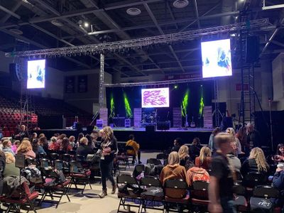 screens from two 8' x 8' in the front with a 14' x 8' screen in the back to the ability of one single 20' x 12' screen on stage. Please contact our visual technicians to create your personal configuration.